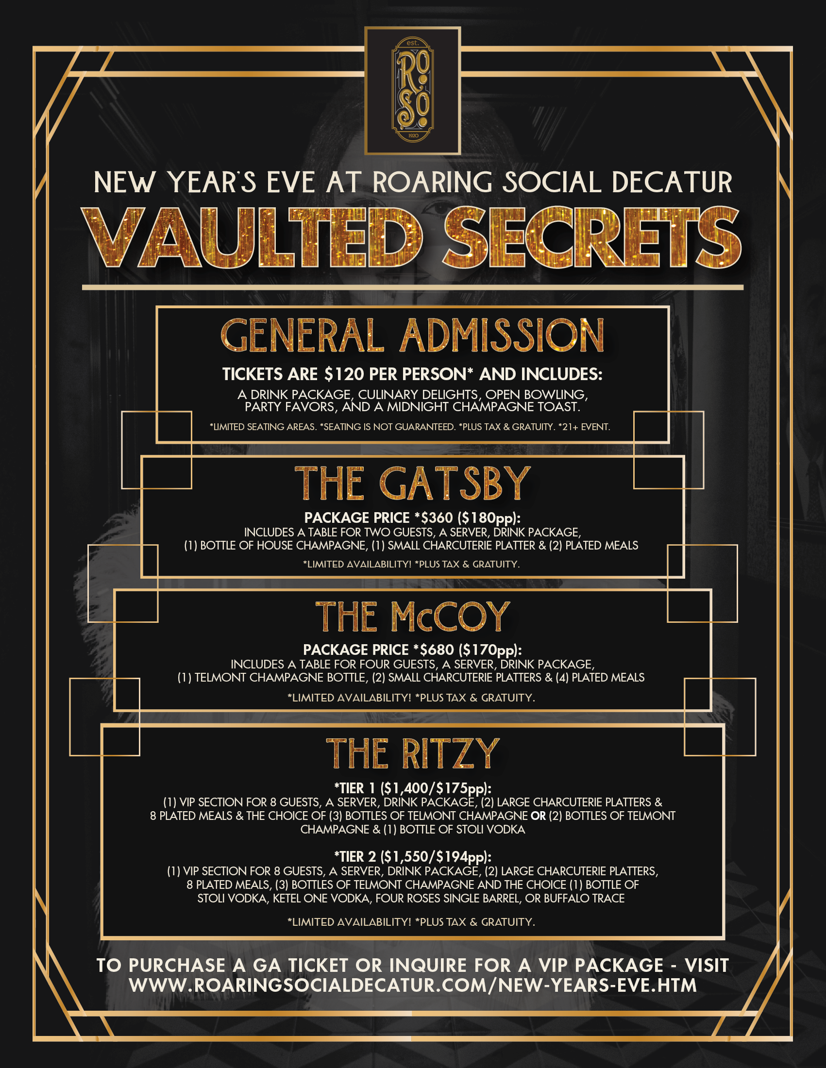 GENERAL ADMISSION TICKETS: (*$120 per person): Includes a Bar Package, Culinary Delights, Bowling, Party Favors, and a Midnight Champagne Toast. *Plus tax and gratuity.